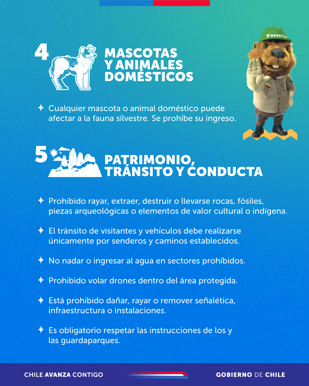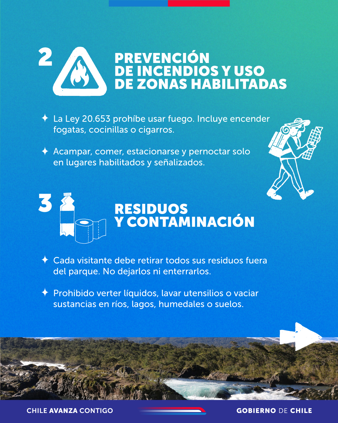 Al respecto, Mariela Órdenes Godoy, jefa del Departamento de Uso Público y Guardaparques de CONAF, explicó que la presencia de personas en áreas protegidas como parques nacionales, reservas nacionales y monumentos naturales no debe afectar su conservación. De acuerdo a la Ley para la Naturaleza (Ley 21600), existen diversas actividades prohibidas (listado completo aquí), entre las que destacan: cazar fauna, ingresar con mascotas, deteriorar infraestructura, volar drones o usar y encender fuego.