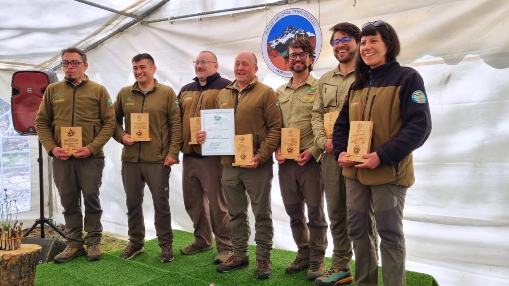 Durante la ceremonia, la oficial senior de UICN, Zornitza Aguilar, y la presidenta del Grupo de expertos EAGL, Lorena Arce, entregaron oficialmente la certificación Lista Verde. Además, el administrador y guardaparques del Parque Nacional Cerro Castillo, entregó reconocimientos a todas y todos los guardaparques de esta unidad, por el trabajo realizado para obtener esta certificación internacional.