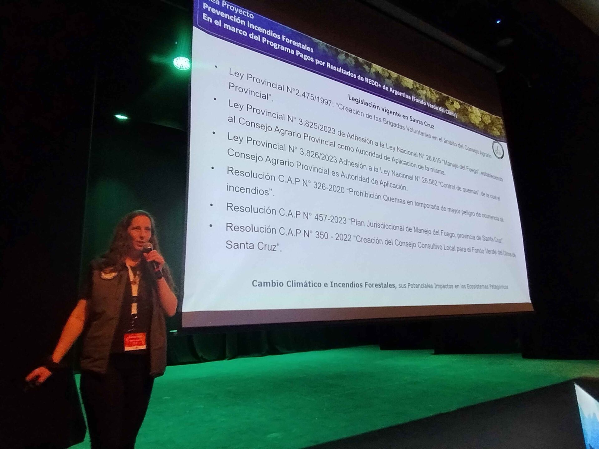 Fue Ayelén Alberti, Directora de Bosques del Consejo Agrario Provincial de Santa Cruz se quién se refirió al plan de prevención de incendios forestales en el marco del programa Pago por Resultados del Fondo Verde del Clima, mientras que el coordinador del plan nacional de manejo del fuego en Argentina lo hizo sobre las asistencia internacionales en grandes incendios forestales que acontecen en la Patagonia.