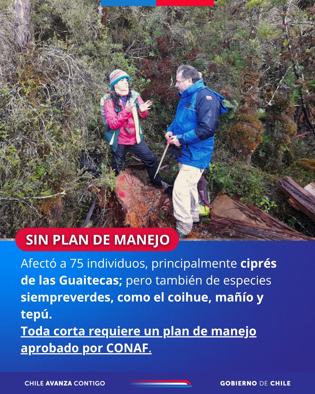 En el sector dañado, se comprobó que el 80% de los ejemplares damnificados correspondía al ciprés de las Guaitecas, una especie protegida por CITES (Comercio Internacional de Especies Amenazadas de Fauna y Flora Silvestre). Asimismo, se realizó una labor enfocada en la toma de muestras, medición de volumen cortado y registro de imágenes que dan cuenta del perjuicio causado.