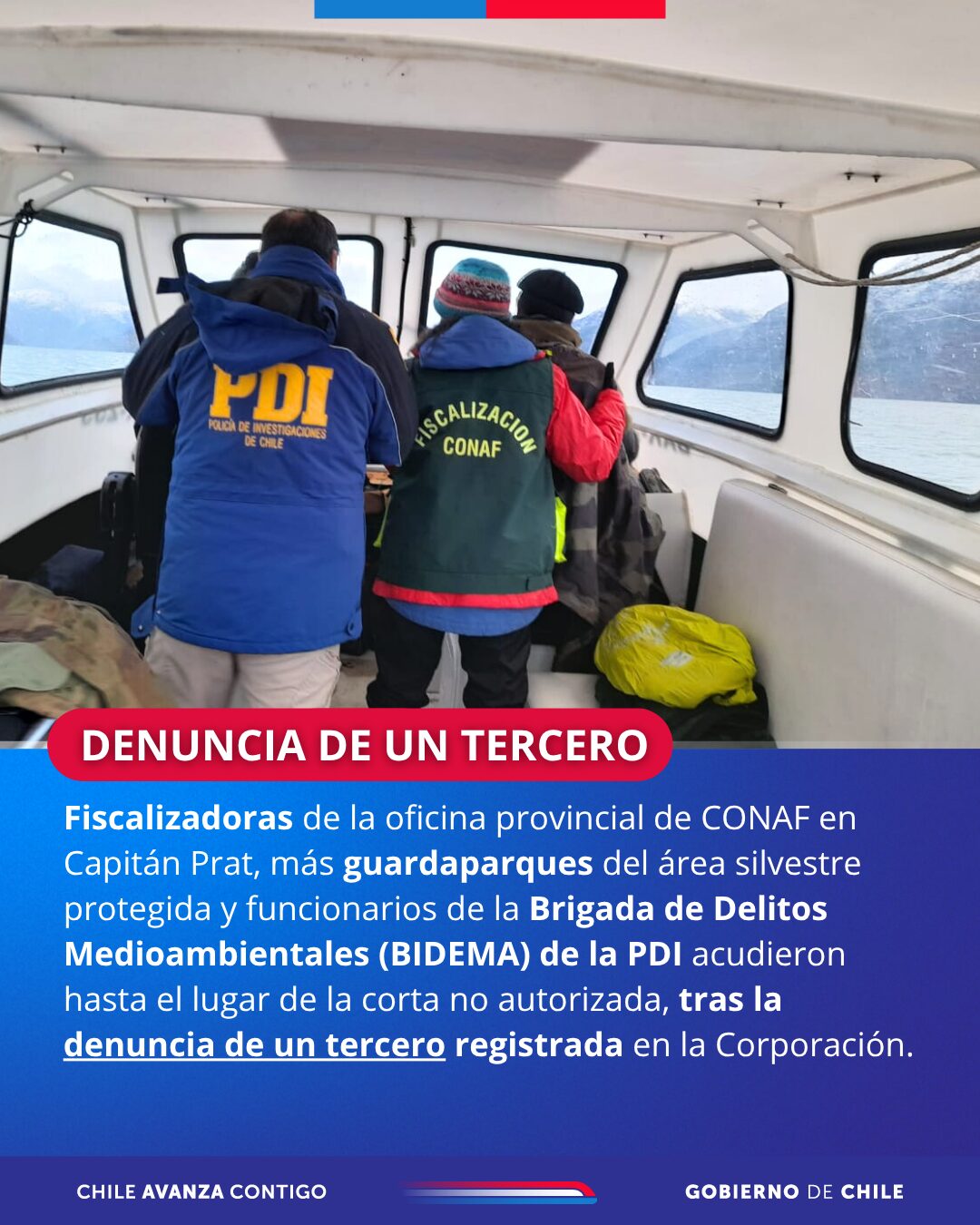 Dos fiscalizadoras de la oficina provincial de CONAF en Capitán Prat, más dos guardaparques del área silvestre protegida y dos funcionarios de la Brigada de Delitos Medioambientales (BIDEMA) de la PDI acudieron hasta el lugar de la corta no autorizada, tras la denuncia de un tercero registrada en la Corporación.