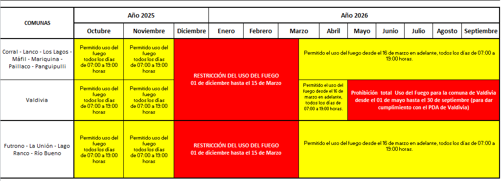 Posteriormente, a partir de diciembre de 2025 hasta el 15 de marzo, regirá la restricción del uso del fuego, teniendo en cuenta que estos meses son considerados como el periodo de mayor ocurrencia de incendios forestales. Asimismo, el 16 de marzo volverá a estar permitido el uso del fuego en todas las comunas de la región. Sin embargo, Valdivia volverá a tener prohibición total del uso del fuego desde el 1 de mayo de 2026 al 30 de septiembre de 2026, esto en el marco del Plan de Descontaminación Atmosférica (PDA) de la capital regional.