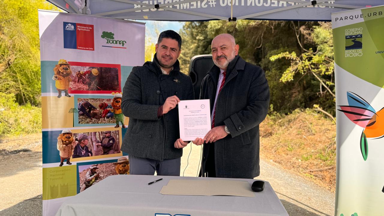 En el marco del proyecto Parque Urbano Sustentable, que impulsa la Universidad del Bío-Bío con recursos del Gobierno Regional del Biobío, la Corporación Nacional Forestal firmó un convenio de colaboración con la casa de estudios superiores, para apoyar el trabajo de restauración del cerro Kimún y planificación de arborización urbana.