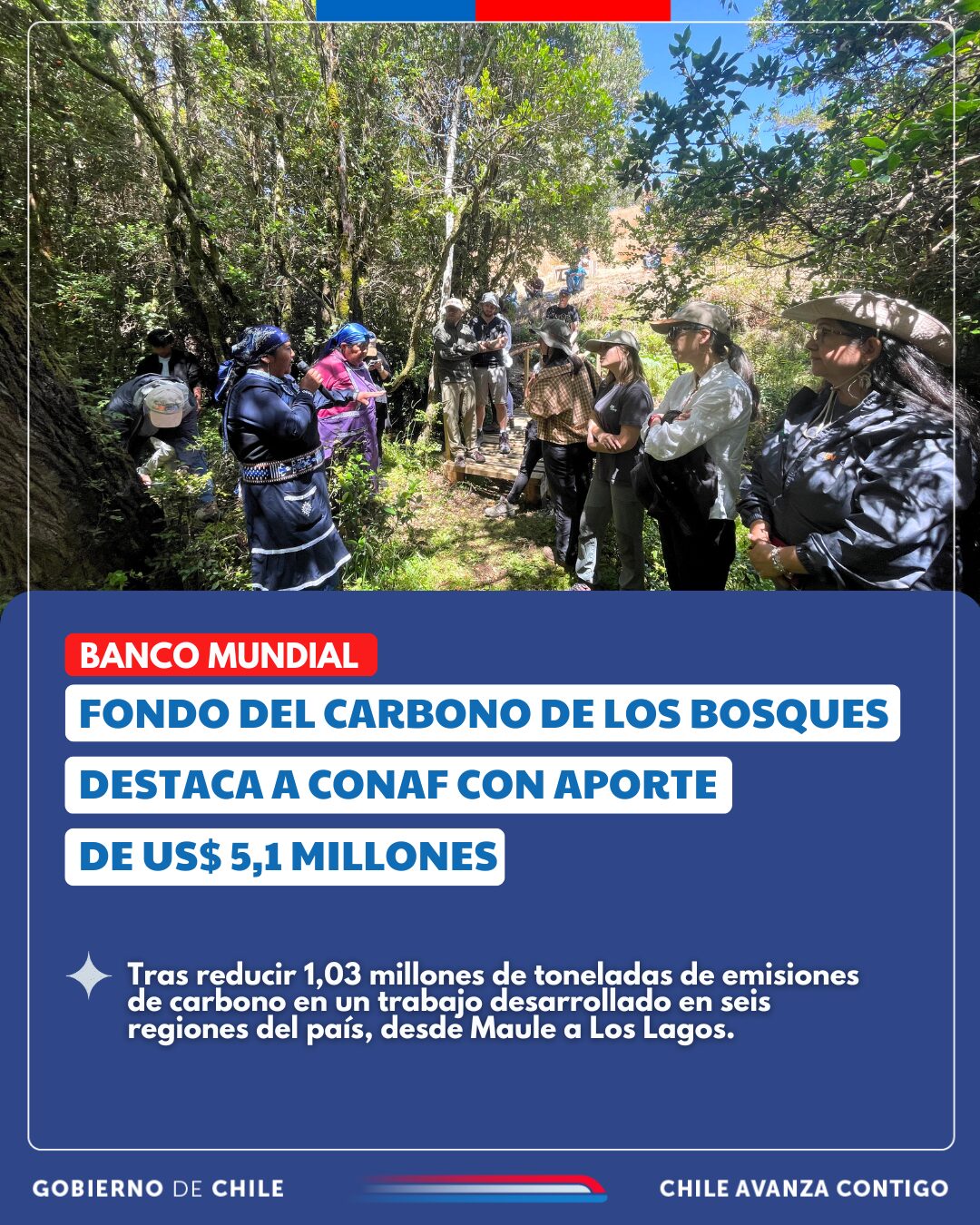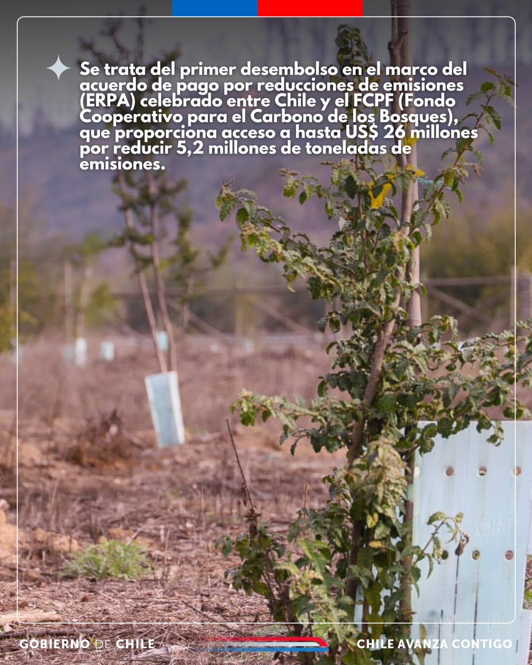 Chile recibió US$ 5,1 millones del Fondo Cooperativo para el Carbono de los Bosques (FCPF) (i) del Banco Mundial por reducir 1,03 millones de toneladas de emisiones de carbono debidas a la deforestación y la degradación forestal (REDD+). Se trata del primer desembolso en el marco del acuerdo de pago por reducciones de emisiones (ERPA) celebrado entre Chile y el FCPF, que proporciona acceso a hasta US$ 26 millones por reducir 5,2 millones de toneladas de emisiones.