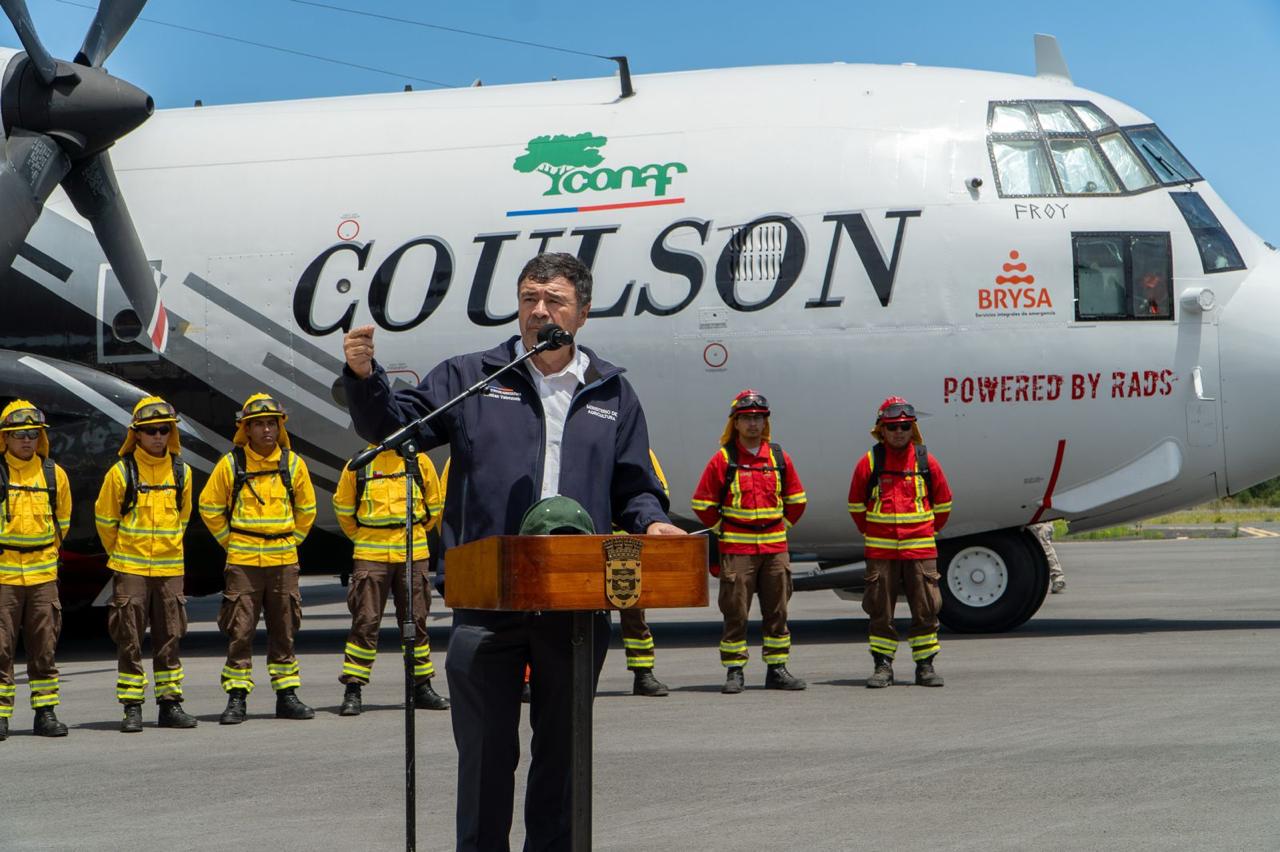 El ministro de Agricultura presentó este avión que tiene una capacidad de lanzamiento de 15.000 litros de agua o retardante y se mantendrá apostado en la Región del Biobío para, desde ahí, realizar el combate de los incendios forestales.
