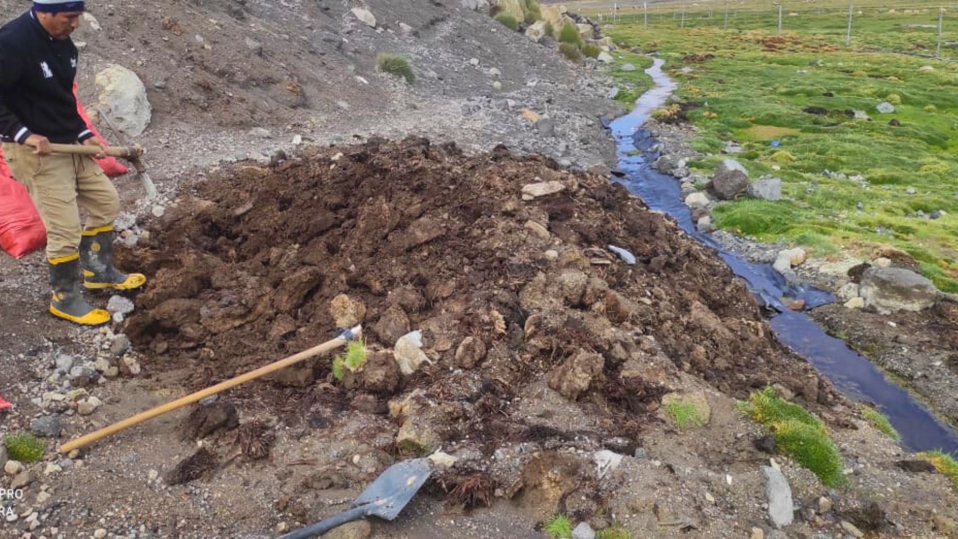“El trabajo lo realizamos a pulso, con palas, picotas y carretillas, junto a los jornales del PZD3 que son parte de este territorio y que realizan labores diarias de monitoreo y remediación ambiental, como un aporte a la comunidad en su conjunto”, explicó Arturo Gómez, administrador del Parque Nacional Lauca.
