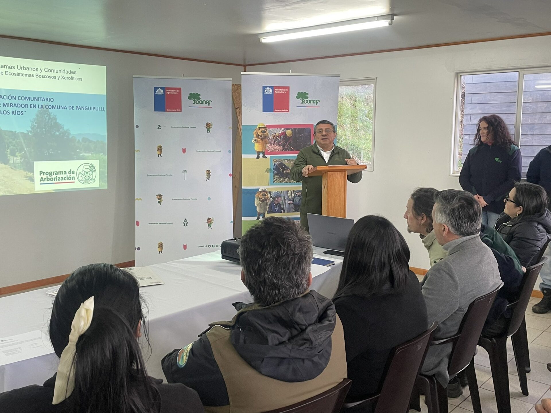 Pedro Burgos, alcalde de Panguipulli precisó que “firmamos este convenio muy relevante con la Corporación Nacional Forestal, a propósito del mejoramiento sustancial de un área verde en la cual confluyen tres unidades vecinales de nuestra ciudad, me refiero a Villa de los Alcaldes, Villa de los Presidentes y Villa de las Terrazas, donde CONAF está realizando una inversión de cerca de 10 millones de pesos para su arborización, su mejoramiento con especies nativas propias de nuestra comuna y donde además la municipalidad a través de nuestra Secretaría de Planificación tiene un proyecto presentado en Subdere que permitiría el mejoramiento con mobiliario urbano y por cierto también iluminación, dando en consecuencia un espacio familiar, un espacio seguro, un espacio también digno para las familias de estas tres unidades vecinales”.