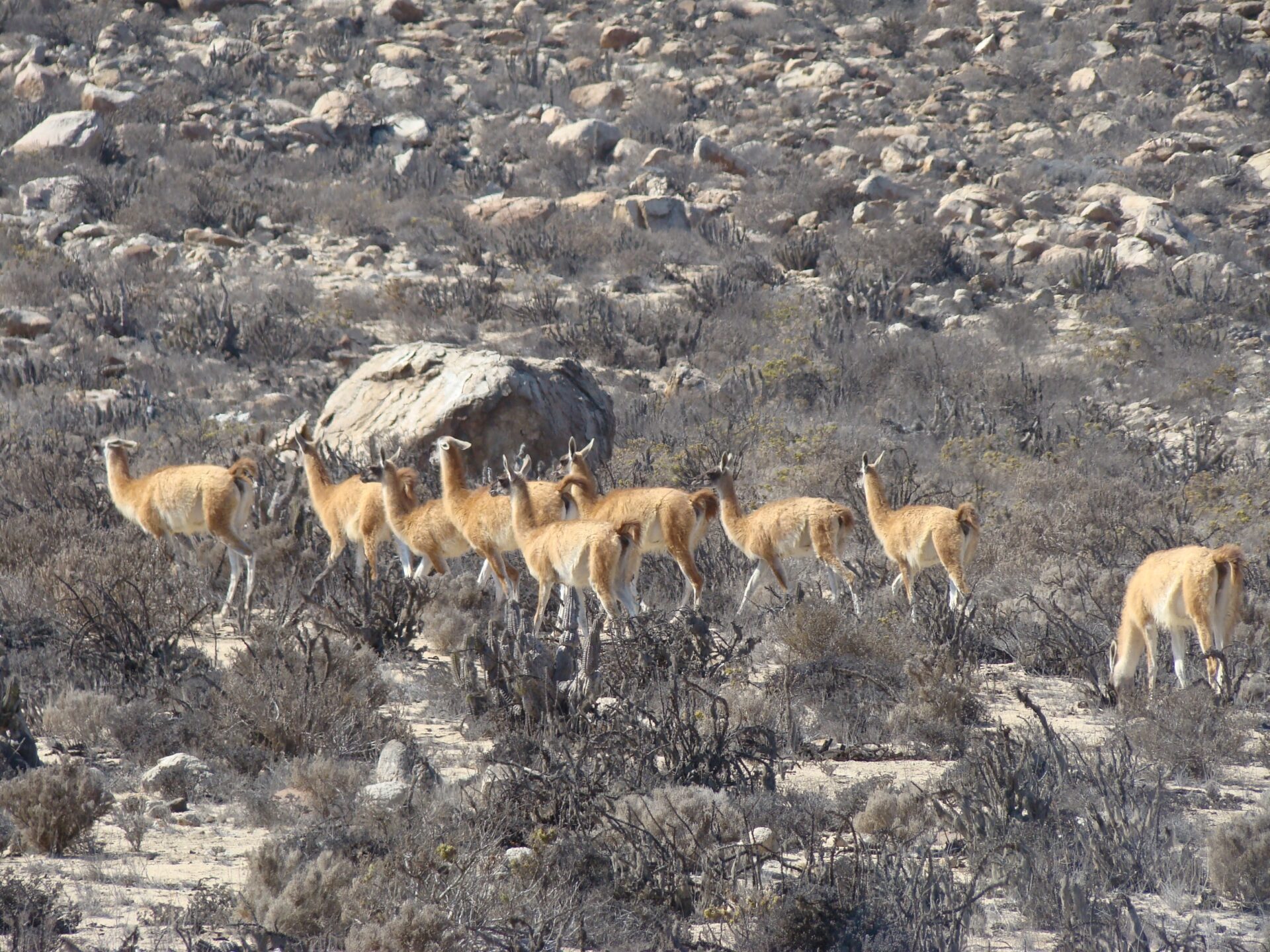 Fauna silvestre | La fauna del parque esta asociada a las comunidades del matorral desértico. Los grupos más abundantes son los de aves, se observan abundantemente especies de paseriformes como diucas (Diuca diuca), mineros (Geositta cunicularia), cometocinos (Phrygilus gayi) y tijerales (Leptasthenura aegithaloides); además de rapaces como: aguiluchos (Geranoaetus polyosoma) y pequenes (Athene cunicularia); carroñeros como el jote (Cathartes aura) y en la zona costera múltiples especies migratorias como chorlos, playeros, zarapitos y rayadores. También pueden observarse mamíferos carnívoros como el zorro chilla (Lycalopex griseus) y zorro culpeo (Lycalopex culpaeus); micromamíferos como el ratón orejudo (Phyllotis darwini) y el ratoncito oliváceo (Abrothrix olivacea); además de una de las dos especies de marsupiales de Chile: la yaca (Thylamys elegans). Uno de los principales objetivos de conservación de este parque esta asociado a las poblaciones de guanaco (Lama guanicoe) presente en él. Es el mamífero silvestre más grande de Chile, puede adaptarse a diversas condiciones ambientales, sobreviviendo a condiciones climáticas extremas como las que encuentra en esta zona semidesértica del Parque Nacional Llanos de Challe, donde ha desarrollado múltiples adaptaciones. El tamaño de los adultos puede alcanzar 1,70 m de altura y hasta 140 kg de peso. Este hermoso animal, reflejo de la identidad atacameña, se encuentra actualmente en peligro de extinción en la Región de Atacama. La caza indiscriminada, el ataque de perros y la fragmentación de su hábitat, son las principales causas de su disminución. |