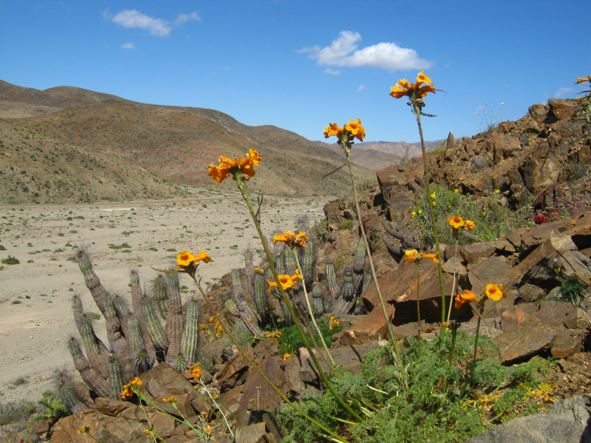 Flora | Las especies vegetales presentes en el Parque Nacional Llanos de Challe corresponden a las formaciones vegetales desierto florido de los llanos y desierto costero de Huasco. Debido a la cercanía al mar y a la presencia de camanchaca o neblinas costeras, estas formaciones vegetales se caracterizan por tener gran continuidad y permanencia en el territorio. Además, presentan una gran diversidad florística producto de lluvias ocasionales que dan origen al fenómeno del desierto florido. La flora la constituyen más de 220 especies distintas, de ellas 206 son nativas de Chile, de las cuales 14 son endémicas, es decir, que solo se pueden encontrar en la Región de Atacama. El parque, además, es refugio de múltiples especies con problemas de conservación. Actualmente alberga a dos especies en peligro de extinción: la garra de león (Bomarea ovallei) y el cactus napina, más otras catorce especies en categoría de conservación vulnerable. Estas y otras llamativas especies de flores de vivos colores son posibles de observar solo con la ocurrencia del desierto florido, fenómeno climático que consiste en el rápido crecimiento y abundante floración de más de 200 especies de plantas anuales y geófitas durante la primavera de años lluviosos. |