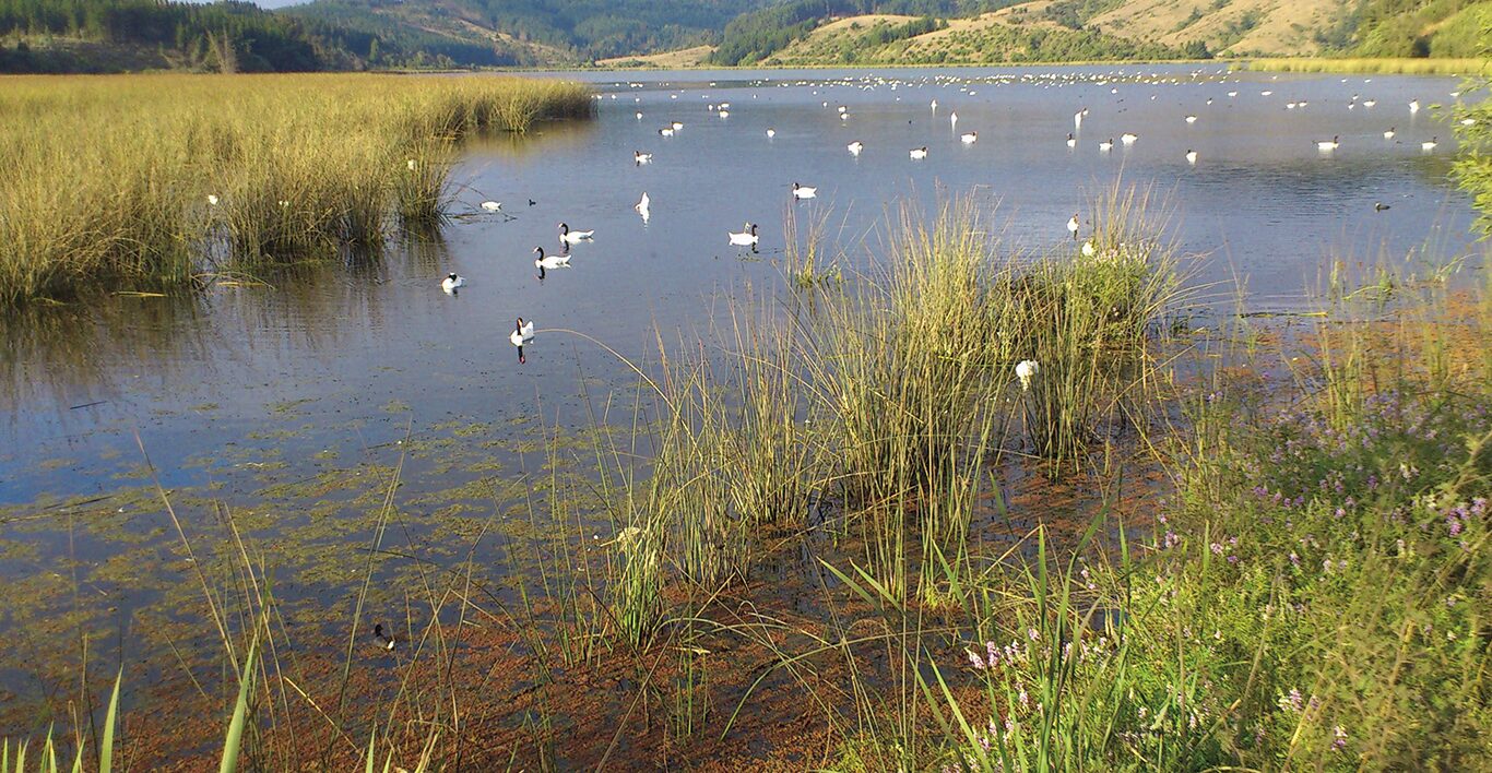Fauna silvestre | Está constituida por peces, aves y mamíferos. En la ictiofauna figuran: liza (Mugil cephalus), pejerrey chileno (Basilichthys australis), tenca (Tenca tinca), carpa (Cyprinus carpio) y pejerrey argentino (Odontesthes bonariensis). Las aves constituyen el grupo más visible del área, con más de noventa especies, entre las que destacan el cisne de cuello negro (Cygnus melancoryphus), el águila pescadora (Pandion haliaetus), cuervo del pantano (Plegadis chihi), cisne coscoroba (Coscoroba coscoroba), huala (Podiceps major), pimpollo (Podiceps rolland), yeco (Phalacrocorax olivaceus), huairavo (Nycticorax nycticorax), huairavillo (Ixobrychus involucris), pato jergón chico (Anas flavirostris), garza cuca (Ardea cocoi), pato rinconero (Heteronetta atricapilla), gaviota garuma (Leucophaeus modestus), siete colores (Trachuris rubrigastra), tagua (Fulica armillata), pidén (Rallus sanguinolentus), tordo (Curaeus curaeus), loica (Sturnella loyca), queltehue (Vanellus chilensis) y tórtola (Zenaida auriculata). Entre los mamíferos se destacan el coipo (Myocastor coypus), el zorro culpeo (Lycalopex culpaeus), el quique (Galictis cuja) y, entre las especies introducidas, la liebre (Lepus europaeus) y el conejo (Oryctolagus cuniculus). |