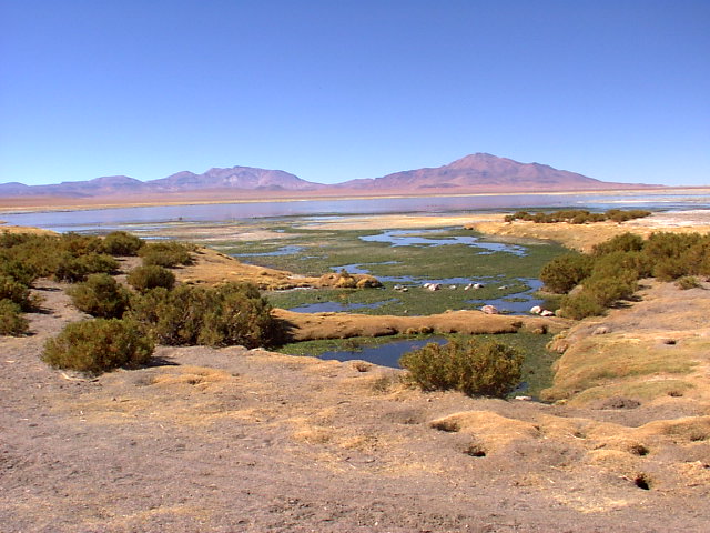 Flora | El desierto del salar de Atacama abarca la cuenca del salar de Atacama y sus alrededores, presenta una homogeneidad de paisajes, con grandes extensiones sin vegetación, la que se concentra en el borde del salar. Los elementos más representativas de esta formación son el cachiyuyo (Atriplex atacamensis), la brea (Tessaria absinthioides), el suncho (Baccharis juncea), la grama ácida (Distichlis spicata), el oreganillo (Acantholippia trifida), la petaloxa (Franseria meyeniana), la rica rica (Acantholippia punensis), el pingo pingo (Ephedra breana), el allaval (Adesmia atacamensis), la malvilla (Cristaria atacamensis) y el cauchal (Coldenia atacamensis). En algunos casos como el sectos Tambillos se observa una plantación de tamarugo (Prosopis tamarugo). La estepa subdesértica de la puna de Atacama presenta una gran extensión en los Andes de la Región de Antofagasta. Tiene una fisionomía de arbustos bajos dispersos en una estepa rala de gramíneas en mechón. Entre las especies más representativas podemos mencionar la pata de pizaca (Fabiana bryoides), la tola vaca (Parastrephia lepidophylla), el coirón amargo (Stipa chrysophylla), el susurco (Mulinum crassifolium), la paja amarilla (Stipa frigida), la copa (Artemisia copa), la tolilla (Fabiana denudata), la llaretilla (Pycnophyllum molle), el ojo de agua (Oxalis exigua), la llareta (Azorella compacta), la coba (Parastrephia quadrangularis), la paposa (Werneria glaberrima), la tola (Baccharis incarum), el lampaya (Lampaya medicinalis), el tomillo macho (Junellia seriphioides) y el puskayo (Opuntia ignescens) entre los más comunes. |
