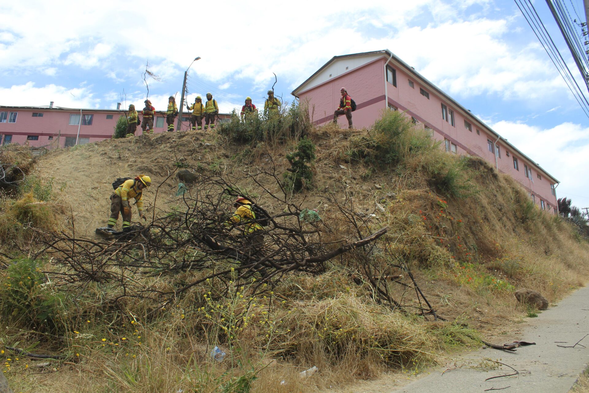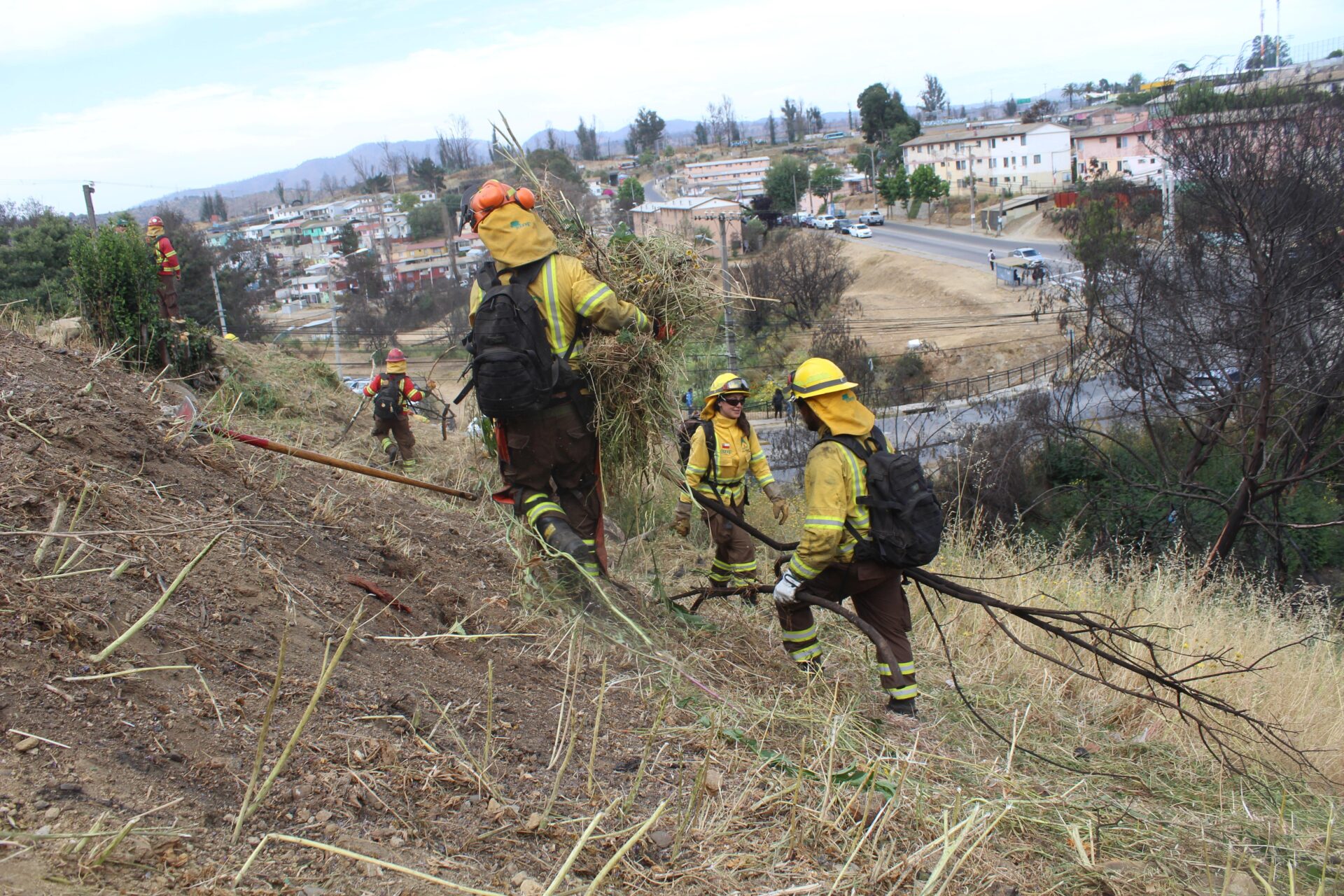 En este contexto, residentes, junto a brigadistas del organismo forestal, funcionarios de la municipalidad y voluntarios de Bomberos, construyeron 200 metros lineales de cortafuegos para la protección de viviendas.
